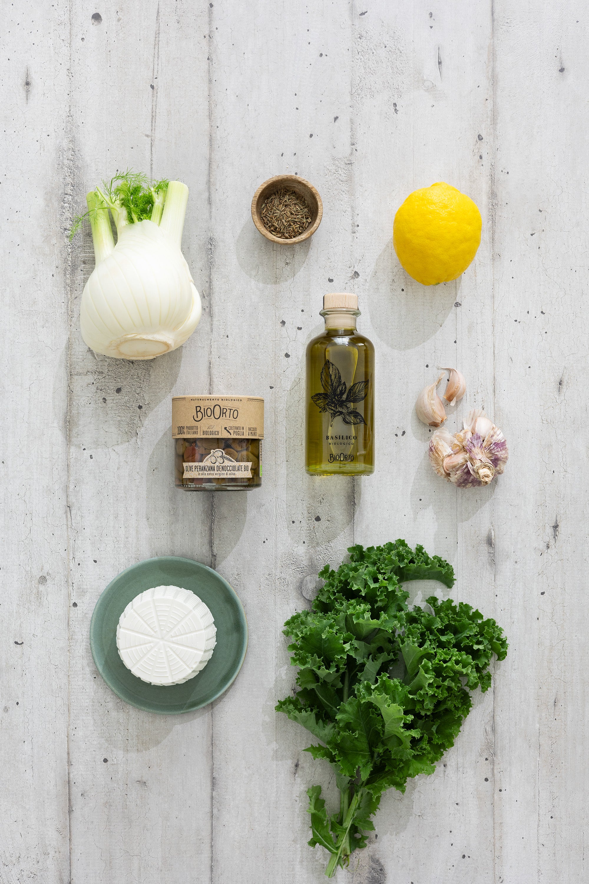 Finocchi con ricotta montata, Olive Peranzana denocciolate e chips di kale